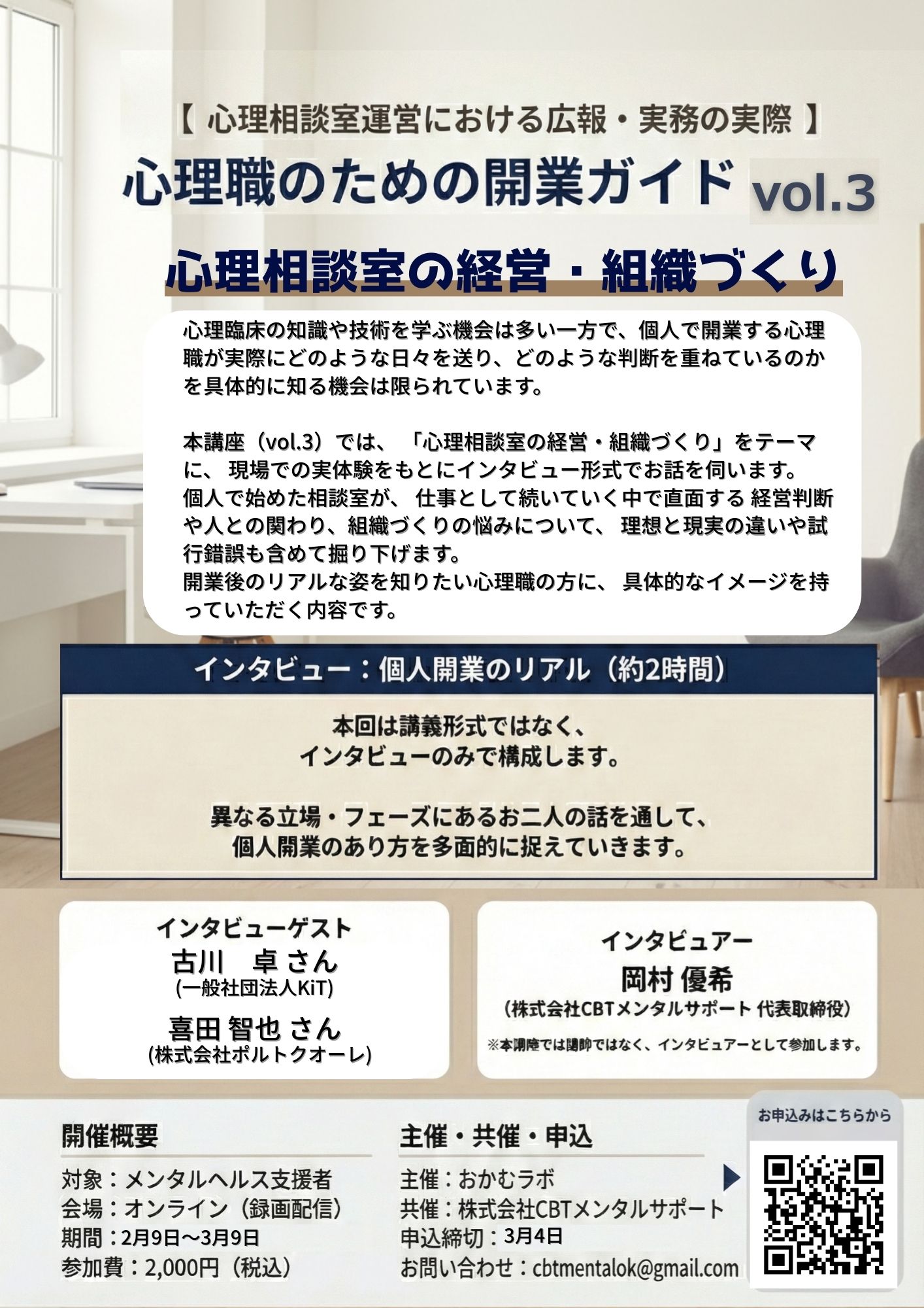 個人で始めた相談室が、 仕事として続いていく中で直面する 経営判断や人との関わり、組織づくりの悩みについて、 理想と現実の違いや試行錯誤も含めて掘り下げます。