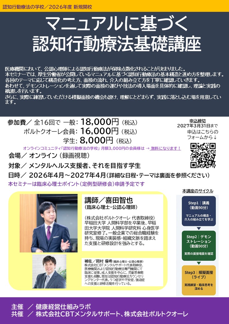第16回2026年3月26日(金)20時~21時 (ライブ開催)強迫症の認知行動療法 ―模擬面接練習会(聴講可能)